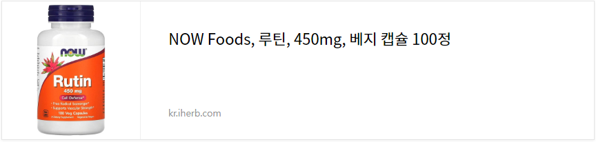 추천드릴 보충제는 나우푸드社의 루틴, 450mg, 베지 캡슐입니다. 1캡슐당 회화나무 꽃봉우리(Sophora japonica)에서 추출한 루틴 분말이 450mg 함유되어 있습니다. 채식주의자 및 비건에게 적합하며 유전자 변형 성분 무함유(Non-GMO), GMP 품질 보증되어 있는 보충제 입니다.