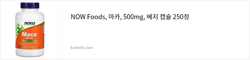 아이허브에서 판매가 가장 많은 나우푸드의 마카 500mg 250 베지 캡슐입니다. 마카 뿌리 단일 성분이고 가격 대비 괜찮은 제품이라 많이 판매가 되는 것 같습니다.