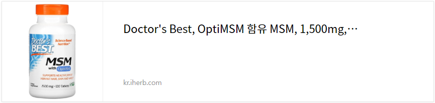 단일 제재로 추천드리는 보충제는 닥터스 베스트의 OptiMSM 함유 MSM 1,500mg입니다. 역시나 아이허브에서 단일 제재로 가장 인기가 많은 보충제로 OptiMSM®을 사용했습니다.