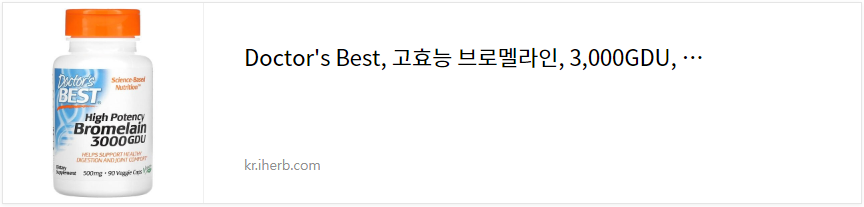 추천드릴 보충제는 닥터스 베스트社의 브로멜라인 3000 GDU, 500mg입니다. 과학 기반 영양™(Science-Based Nutrition™), 비건에게 적합, 유전자 변형 성분 무함유(Non-GMO), 글루텐 프리 보충제입니다.