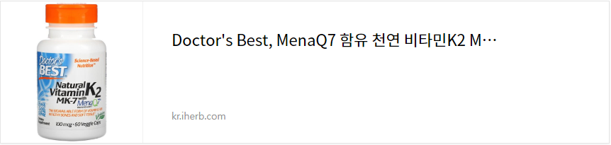 추천드릴 보충제는 닥터스 베스트社의 MenaQ7® 함유 천연 비타민K2 MK-7, 100mcg입니다. 비건 및 채식주의자에게 적합하며 과학 기반 영양™(Science-Based Nutrition™), 유전자 변형 성분 무함유(Non-GMO), 글루텐 무함유, 대두 무함유 보충제 입니다.