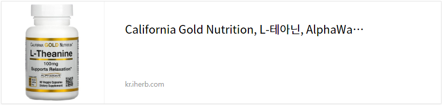 추천드릴 보충제는 아이허브 자체 브랜드인 캘리포니아 골드 뉴트리션의 L-테아닌, 알파웨이브®( AlphaWave®), 200mg 입니다. L-테아닌단일 성분으로 구성되어 있으며 글루텐 프리, 유전자 변형 성분 무함유(Non-GMO), 대두 무함유, cGMP 인증 시설에서 생산, 100% 골드 개런티(Gold Guarantee) 보충제입니다.