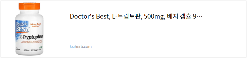 추천드릴 보충제는 닥터스 베스트社의 L-트립토판, 500mg입니다. 과학기반영양™(Science-Based Nutrition™), 유전자 변형 성분 무함유(Non-GMO), 글루텐 프리, 대두 무함유, 비건 보충제입니다.